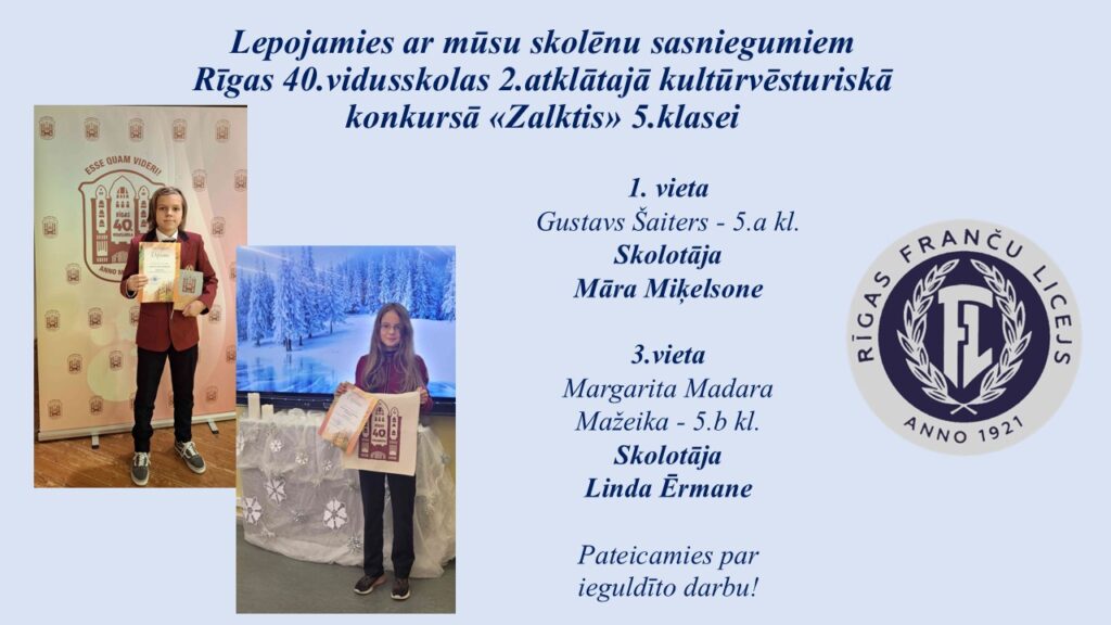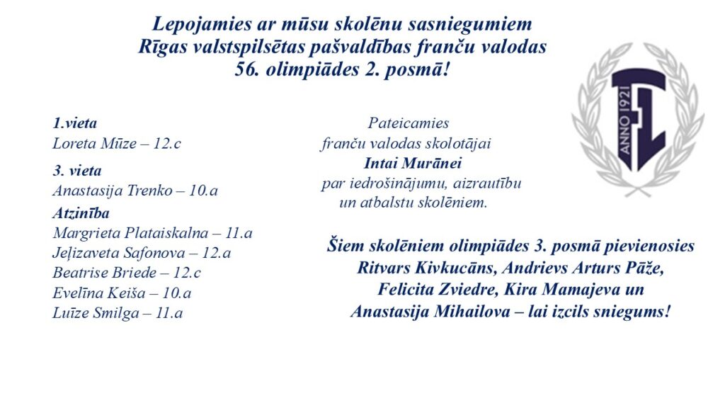 Apbalvojumi Rīgas valstspilsētas pašvaldības angļu valodas 55. olimpiādes 2. posmā