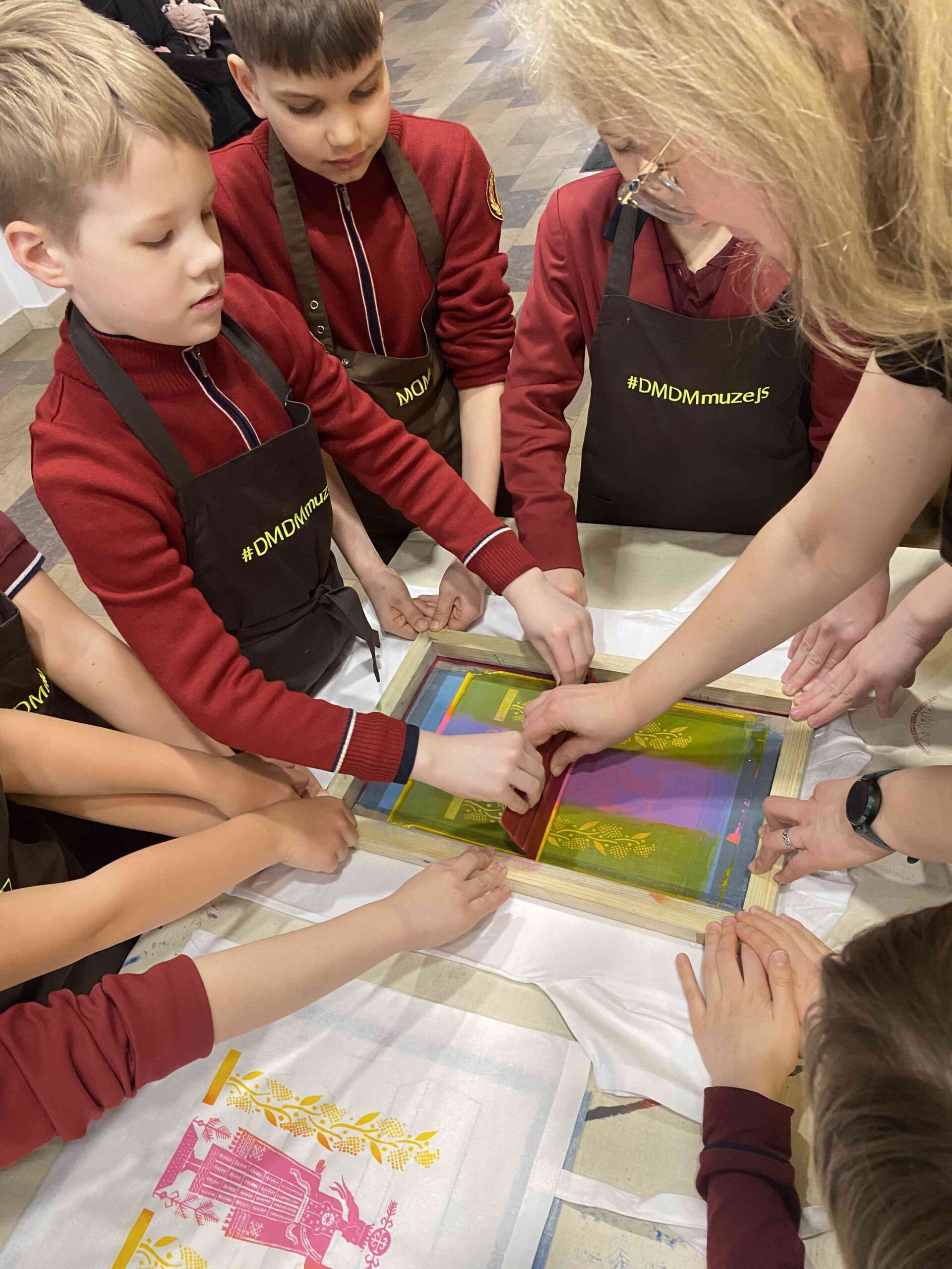 Nodarbībā radošā veidā skolēni tika iepazīstināti ar vienu no galvenajām tekstilmākslas apdrukas tehnikām — sietspiedi. Nodarbības ievadā skolēni pētīja gleznotāja un lietišķās mākslas meistara Anša Cīruļa madarojumus un dažādus sietspiedes tehnikā sagatavotu apdrukātu darbu paraugus. Tekstilmākslinieka vadībā tika izzināts dizaina veidošanas process — no skices līdz apdrukātam audumam. Katram skolēnam bija iespēja izmēģināt šo seno tehniku, izmantojot sietus, kas veidoti pēc Latvijas vecmeistaru (Anša Cīruļa, Jūlija Straumes un Jūlija Madernieka) un jauno mākslinieku darbu motīviem.